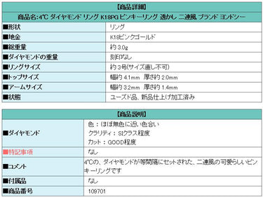 商品名:4℃ ダイヤモンド リング K18PG ピンキーリング 透かし 二連風 ブランド ヨンドシー