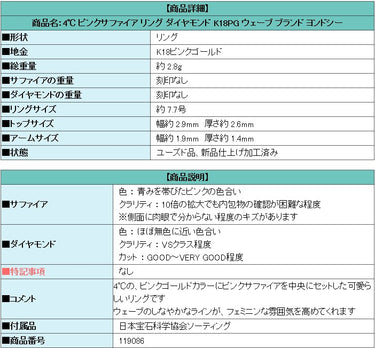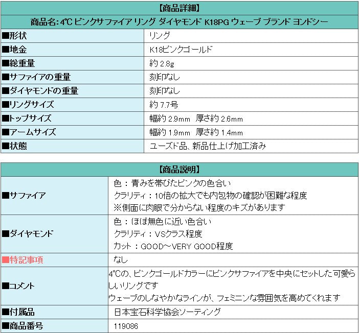商品名:4℃ ピンクサファイア リング ダイヤモンド K18PG ウェーブ ブランド ヨンドシー