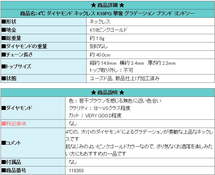 商品名:4℃ ダイヤモンド ネックレス K18PG 華奢 グラデーション ブランド ヨンドシー
