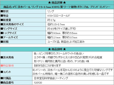 商品名:4℃ 淡水パール リング 2.5-3.7mm K18YG 葉 リーフ 植物 ボタニカル ブランド ヨンドシー