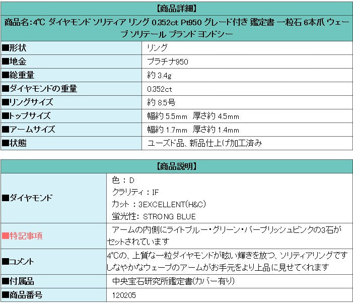 商品名:4℃ ダイヤモンド ソリティア リング 0.352ct Pt950 グレード付き 鑑定書 一粒石 6本爪 ウェーブ ソリテール ブランド ヨンドシー