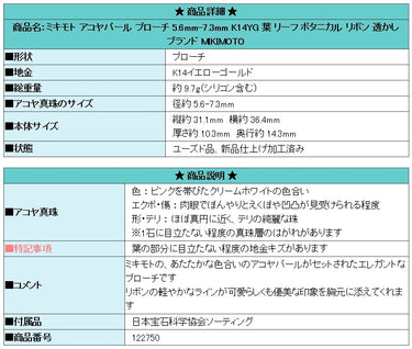 商品名:ミキモト アコヤパール ブローチ 5.6mm-7.3mm K14YG 葉 リーフ ボタニカル リボン 透かし ブランド MIKIMOTO