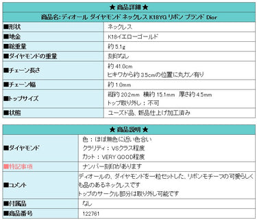 商品名:ディオール ダイヤモンド ネックレス K18YG リボン ブランド Dior