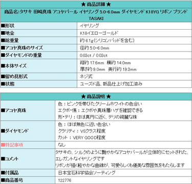 商品名:タサキ 田崎真珠 アコヤパール イヤリング 5.0-6.0mm ダイヤモンド K18YG リボン ブランド TASAKI