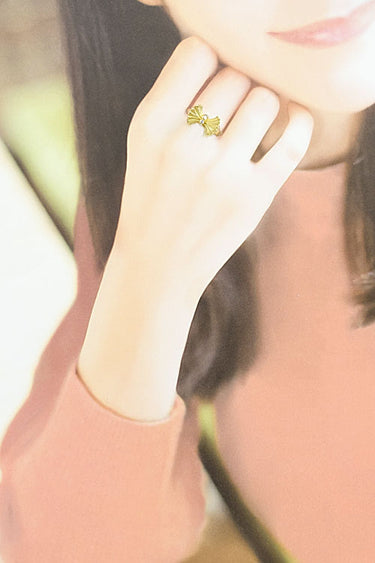 星の砂の、立体的なひらひらとしたリボンの中央にダイヤモンドをセットした可愛らしいリングです