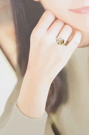 コメント タサキの、小ぶりなアコヤパールが艶やかにテリ輝く、上品なリングです。ふんわりとしたリボンがデザインされており、ブーケのような可愛らしさがお手元を包み込みます。