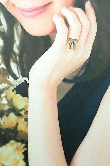 コメント リボンタイのようなモチーフが指先を包む、エレガントな雰囲気のリングです。石留部分にはダイヤモンドを引き立てるようにプラチナが使用されており、細部にこだわりを感じるお品です。