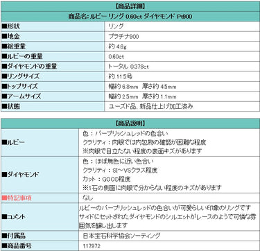 商品名:ルビー リング 0.60ct ダイヤモンド Pt900