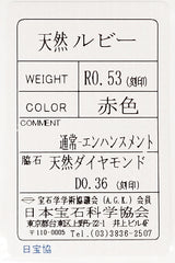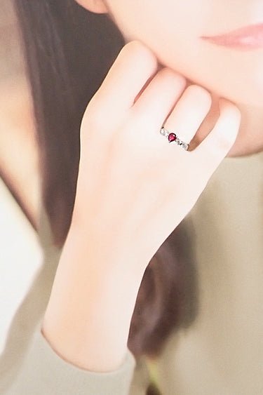 コメント ルビーの濃いピンキッシュレッドとダイヤモンドのコントラストが美しくエレガントなリングです。つるりとしたアームで、デイリーユースにもおすすめな着け心地の良いお品です。
