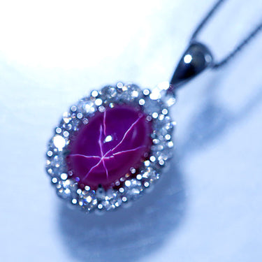 コメント クレサンベールの、はっきりとしたスター効果がお楽しみいただける、上品な再結晶スタールビーのネックレスです。ルビーを取り囲んだダイヤモンドがキラキラとした輝きで、胸元に華やかさを添えてくれます。