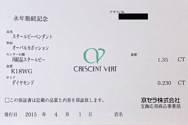 ※スター効果 : 強い光の下でははっきりとシャープなスターが確認可能で、室内光の下でもうっすらとスターが確認可能。再結晶スタールビーは、京セラ独自の宝石合成技術や結晶技術によって生まれた、天然石と同じ組成を持つ人工の宝石です。