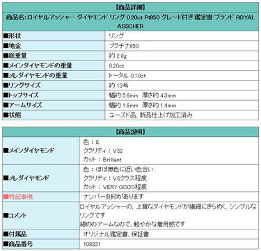 商品名:ロイヤルアッシャー ダイヤモンド リング 0.20ct Pt950 グレード付き 鑑定書 ブランド ROYAL ASSCHER