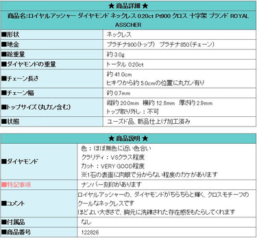 商品名:ロイヤルアッシャー ダイヤモンド ネックレス 0.20ct Pt900 クロス 十字架 ブランド ROYAL ASSCHER