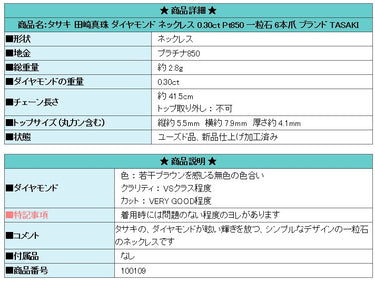 商品名:タサキ 田崎真珠 ダイヤモンド ネックレス 0.30ct Pt850 一粒石 6本爪 ブランド TASAKI