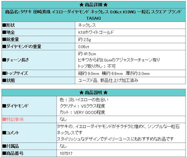 商品名:タサキ 田崎真珠 イエローダイヤモンド ネックレス 0.06ct K18WG 一粒石 スクエア ブランド TASAKI