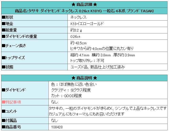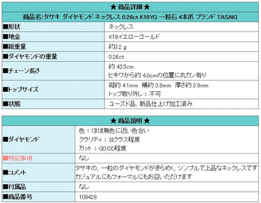 商品名:タサキ ダイヤモンド ネックレス 0.26ct K18YG 一粒石 4本爪 ブランド TASAKI