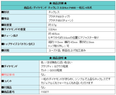 商品名:ダイヤモンド ネックレス 0.324ct Pt900 一粒石 4本爪
