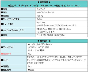 商品名:タサキ ダイヤモンド ネックレス 0.40ct K18YG 一粒石 4本爪 ブランド TASAKI