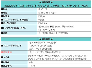 商品名:タサキ イエローダイヤモンド ネックレス 0.37ct K18WG 一粒石 4本爪 ブランド TASAKI