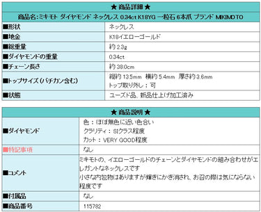 商品名:ミキモト ダイヤモンド ネックレス 0.34ct K18YG 一粒石 6本爪 ブランド MIKIMOTO