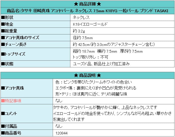 商品名:タサキ 田崎真珠 アコヤパール ネックレス 7.5mm K18YG 一粒パール ブランド TASAKI