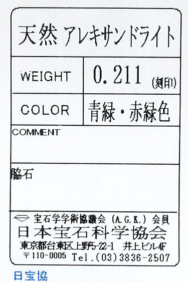 アレキサンドライト 色:通常光のもとでは青みのある深いグリーンカラー、白熱光のもとでは赤みの強いパープルカラー