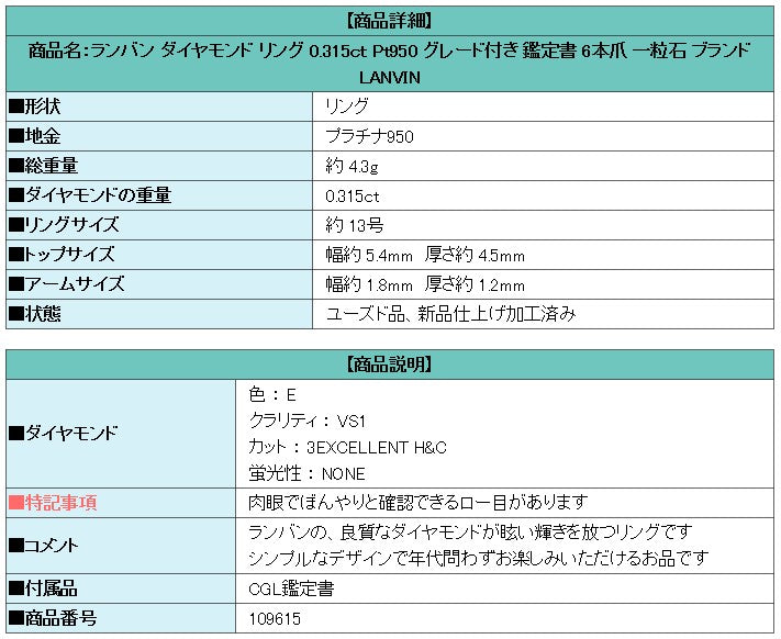 商品名:ランバン ダイヤモンド リング 0.315ct Pt950 グレード付き 鑑定書 6本爪 一粒石 ブランド LANVIN