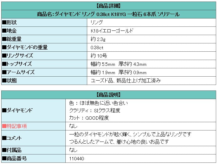 商品名:ダイヤモンド リング 0.38ct K18YG 一粒石 6本爪 ソリテール