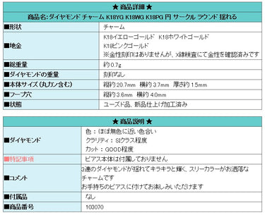 コメント 3連のダイヤモンドが揺れてキラキラと輝く、スリーカラーがお洒落なチャームです お手持ちのピアスに付けてお楽しみいただけます