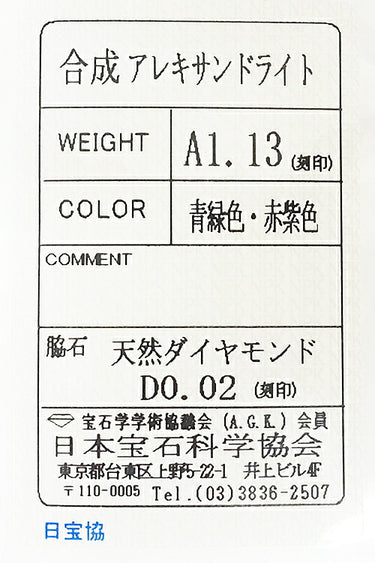 アレキサンドライト 色:通常光のもとでは青みのある深いグリーンカラー、白熱光のもとでは赤みの強いパープルカラー