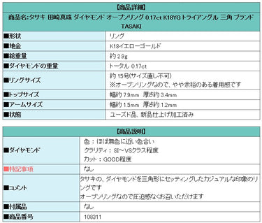 商品名:タサキ 田崎真珠 ダイヤモンド オープンリング 0.17ct K18YG トライアングル 三角 ブランド TASAKI