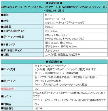 商品名:ダイヤモンド フックピアス 0.26ct アコヤパール K18WG K18YG プリンセスカット ファンシーカット 変形カット 揺れる