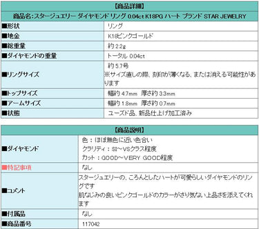 商品名:スタージュエリー ダイヤモンド リング 0.04ct K18PG ハート ブランド STAR JEWELRY