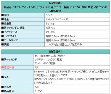 商品名:ミキモト ダイヤモンド リング K18YG 花 フラワー 植物 ボタニカル 細め 華奢 V字 ブランド MIKIMOTO