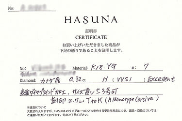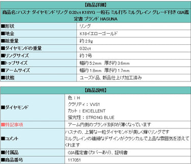 商品名:ハスナ ダイヤモンド リング 0.32ct K18YG 一粒石 ミル打ち ミルグレイン グレード付き GIA鑑定書 ブランド HASUNA