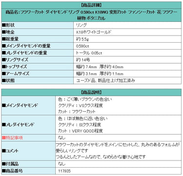 商品名:フラワーカット ダイヤモンド リング 0.590ct K18WG 変形カット ファンシーカット 花 フラワー 植物 ボタニカル