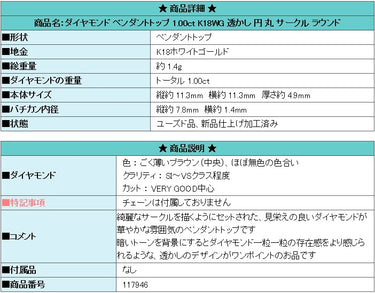 商品名:ダイヤモンド ペンダントトップ 1.00ct K18WG 透かし 円 丸 サークル ラウンド