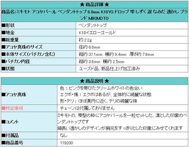 商品名:ミキモト アコヤパール ペンダントトップ 6.8mm K18YG ドロップ 雫 しずく 涙 なみだ 透かし ブランド MIKIMOTO