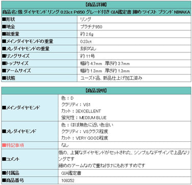 商品名:俄 ダイヤモンド リング 0.23ct Pt950 グレード付き GIA鑑定書 細め ツイスト ブランド NIWAKA