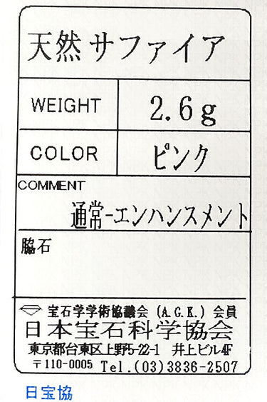 ピンクサファイア 色:青みのピンクの色合い