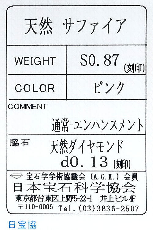 ピンクサファイアの重量 0.87ct