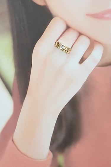 コメント タサキの、レールセッティングされた一粒のダイヤモンドが眩い輝きを放つ、エレガントなリングです。ゆったりとした重ね付けのようなデザインで、程よい存在感のあるお品です。