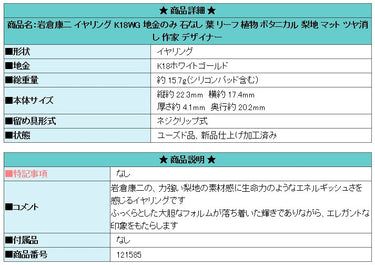 商品名:岩倉康二 イヤリング K18WG 地金のみ 石なし 葉 リーフ 植物 ボタニカル 梨地 マット ツヤ消し 作家 デザイナー