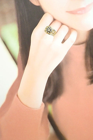 コメント 梶光夫の、チェックの透かしと太陽のようなデザインの中央にテリの良いダイヤモンドが煌めく、情熱的で華やかなリングです。隣り合う指とくびれたアームが沿うデザインになっており、心地の良い着用感でお召いただけます。