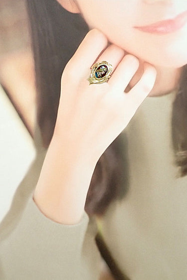 コメント 梶光夫の、作家クリスティーヌ・シェロンが描いたエマーユを使用した、優雅なリングです。なめらかな曲線を描くリボンのような優美な枠は、存在感がありながらもしっかりと指に沿うデザインになっています。