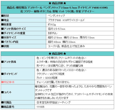商品名:檜佐賢治 アコヤパール ペンダントトップ 2.5mm-5.7mm ダイヤモンド Pt900 K18WG 花 フラワー 植物 ボタニカル 梨地 マット ツヤ消し 作家 デザイナー