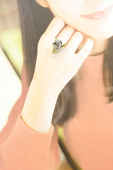 商品名 水野薫子 ブラックダイヤモンド リング K18イエローゴールド K18ホワイトゴールド KAORUKO MIZUNO 作家 デザイナー ローズ バラ 花 フラワー 植物 ボタニカル V字 梨地 マット ツヤ消し