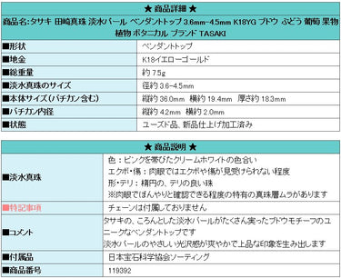 商品名:タサキ 田崎真珠 淡水パール ペンダントトップ 3.6mm-4.5mm K18YG ブドウ ぶどう 葡萄 果物 植物 ボタニカル ブランド TASAKI