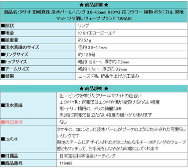 商品名:タサキ 田崎真珠 淡水パール リング 3.8-4.2mm K18YG 花 フラワー 植物 ボタニカル 梨地 マット ツヤ消し ウェーブ ブランド TASAKI