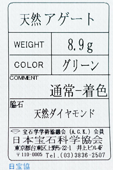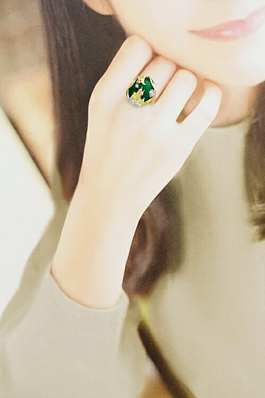 アズタイムの、アゲートの豊かなグリーンを背景にしたメルヘンな雰囲気のリングです